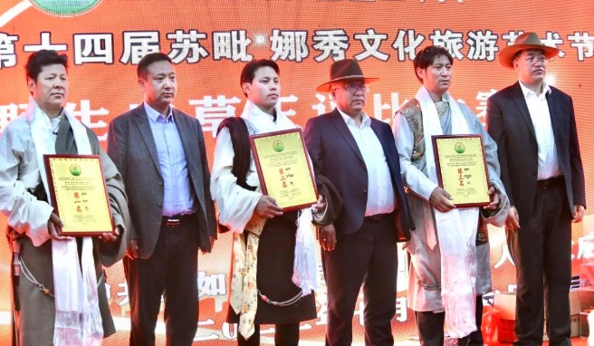 經(jīng)過評比,茶曲鄉(xiāng)茶久的蟲草以整體質(zhì)量最佳獲得蟲草鮮草單斤第一名,第二名和第三名則是來自茶曲鄉(xiāng)的曲嘎和夏曲鎮(zhèn)的羅杰;獲得蟲草陳草單斤第一名的是來自達塘鄉(xiāng)的貢嘎,達塘鄉(xiāng)的索朗達杰榮獲第二名,茶曲鄉(xiāng)的措白為第三名,出席領(lǐng)導(dǎo)為獲獎選手頒獎。