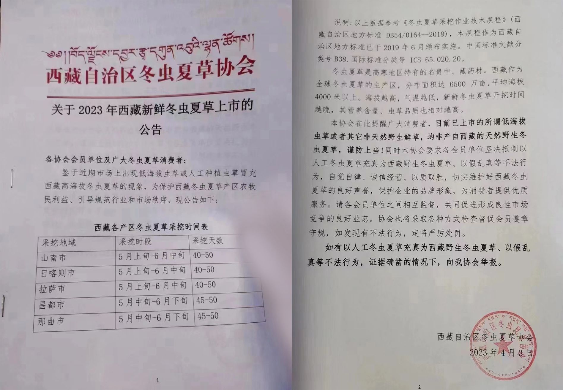 鑒于近期市場上出現(xiàn)低海拔蟲草或人工種植蟲草冒充西藏高海拔冬蟲夏草的現(xiàn)象,為保護(hù)西藏冬蟲夏草產(chǎn)區(qū)農(nóng)牧民利益、引導(dǎo)規(guī)范行業(yè)和市場秩序,現(xiàn)公告如下: